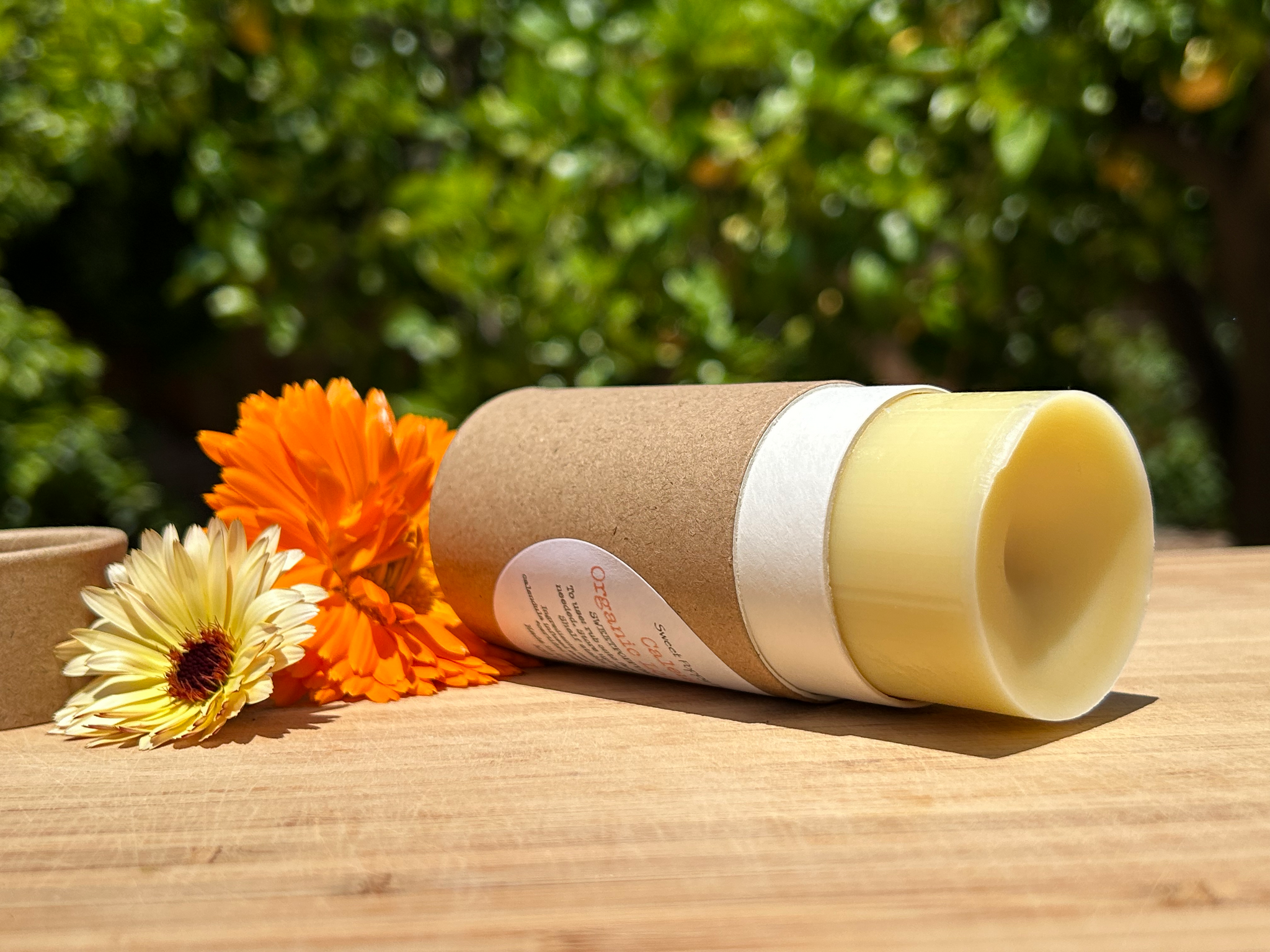 Our organic solid calendula lotion stick is made with 100% natural and pure ingredients that protect and moisturize your skin. Great for every day use, traveling, eczema, and dry, or cracked skin. Sensitive skin friendly. Easy, no mess application. Container is a push up tube that is 100% compostable. Shipping materials and packaging is also zero waste and eco friendly. No plastic!