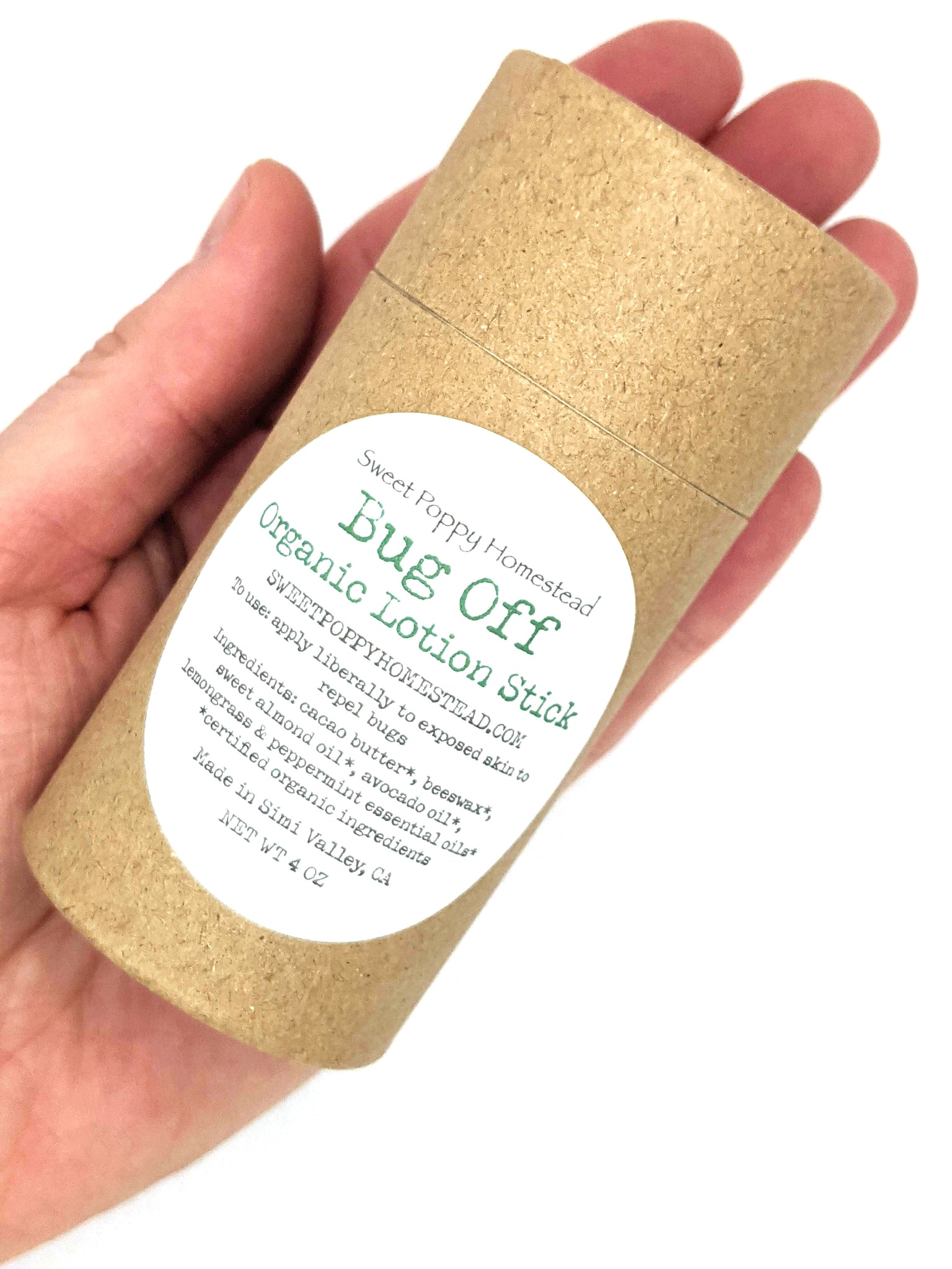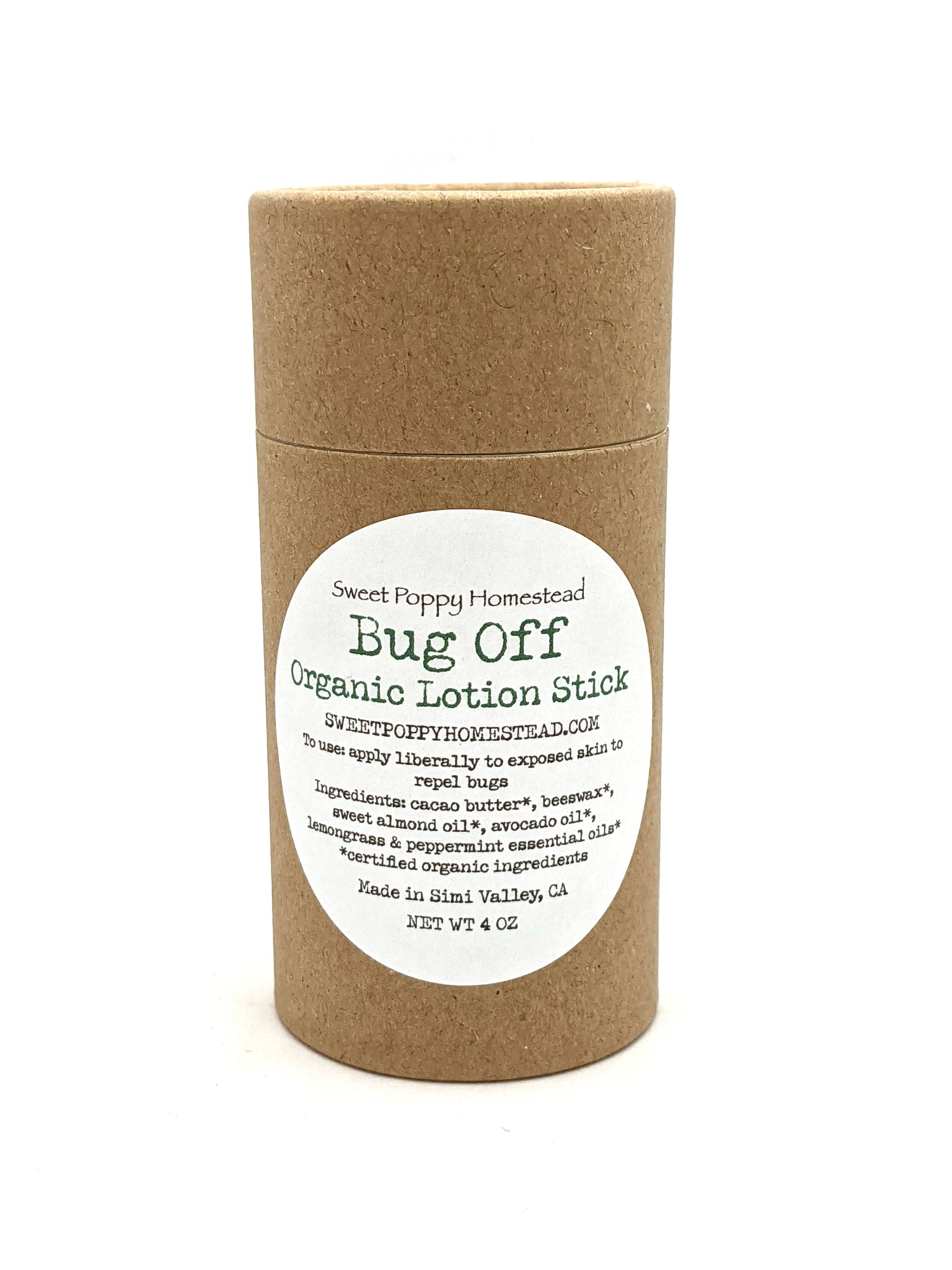 Enjoy the outdoors without those pesky bugs! Our large bug off lotion stick is handcrafted, 100% organic, and all natural with high quality purposeful ingredients that help keep your skin smooth, soft, and nourished. Lotion bar contains natural essential oils that help repel mosquitoes, ticks, and fleas. Enjoy beautiful lemongrass & peppermint fragrance without worry for spills. Lotion stick and packaging are eco-friendly.