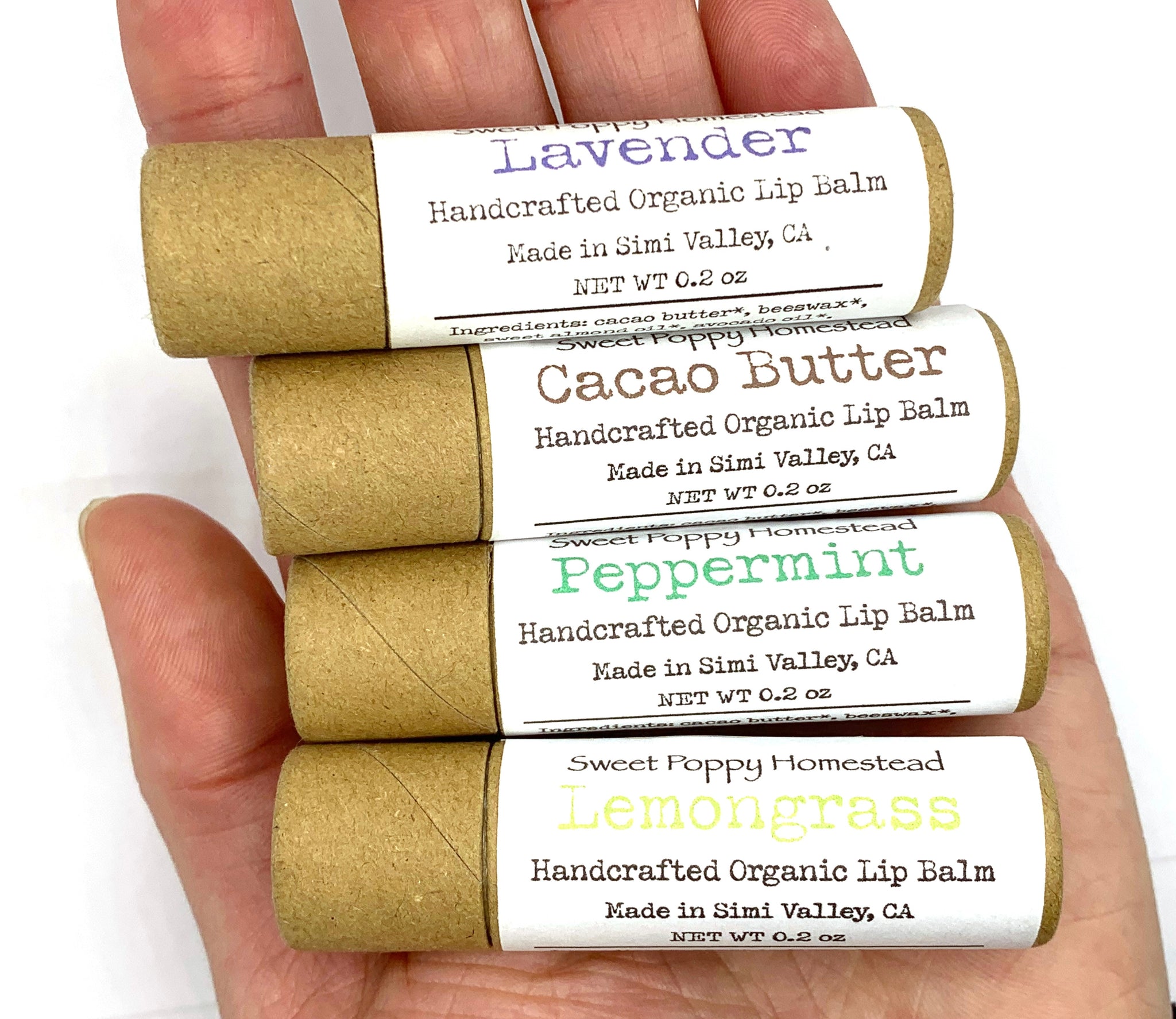Our lip balm gift set includes four 0.2 ounce lip balms (lavender, peppermint, lemongrass, and unscented cacao butter) and is handcrafted, 100% organic, and all natural with high quality purposeful ingredients that help keep your lips smooth, soft, and nourished. Our lip balm has a smooth texture and lasts. Lip balm and packaging are eco-friendly including the lip balm tube that is made of kraft paperboard and is 100% recyclable, biodegradable, and compostable.