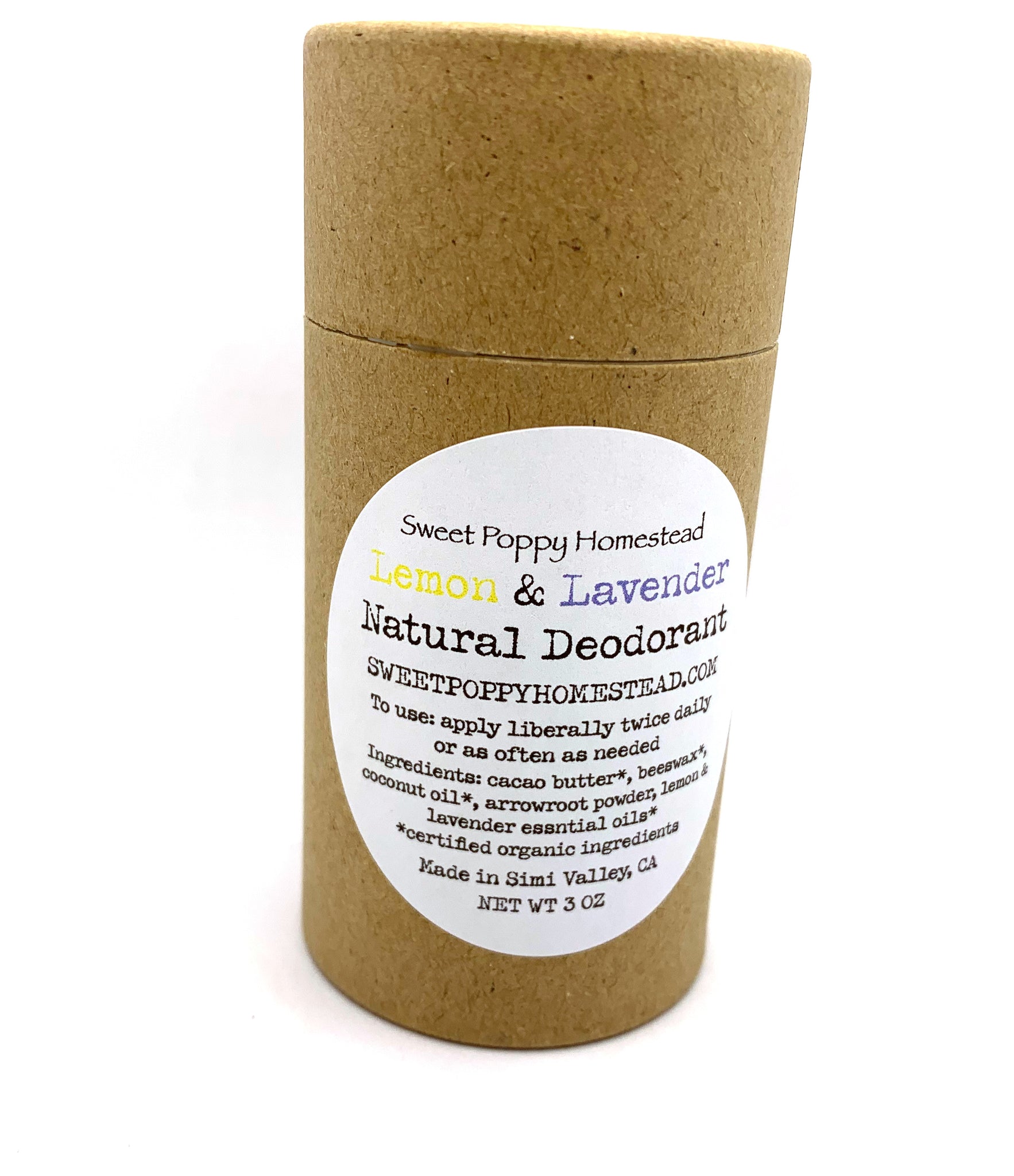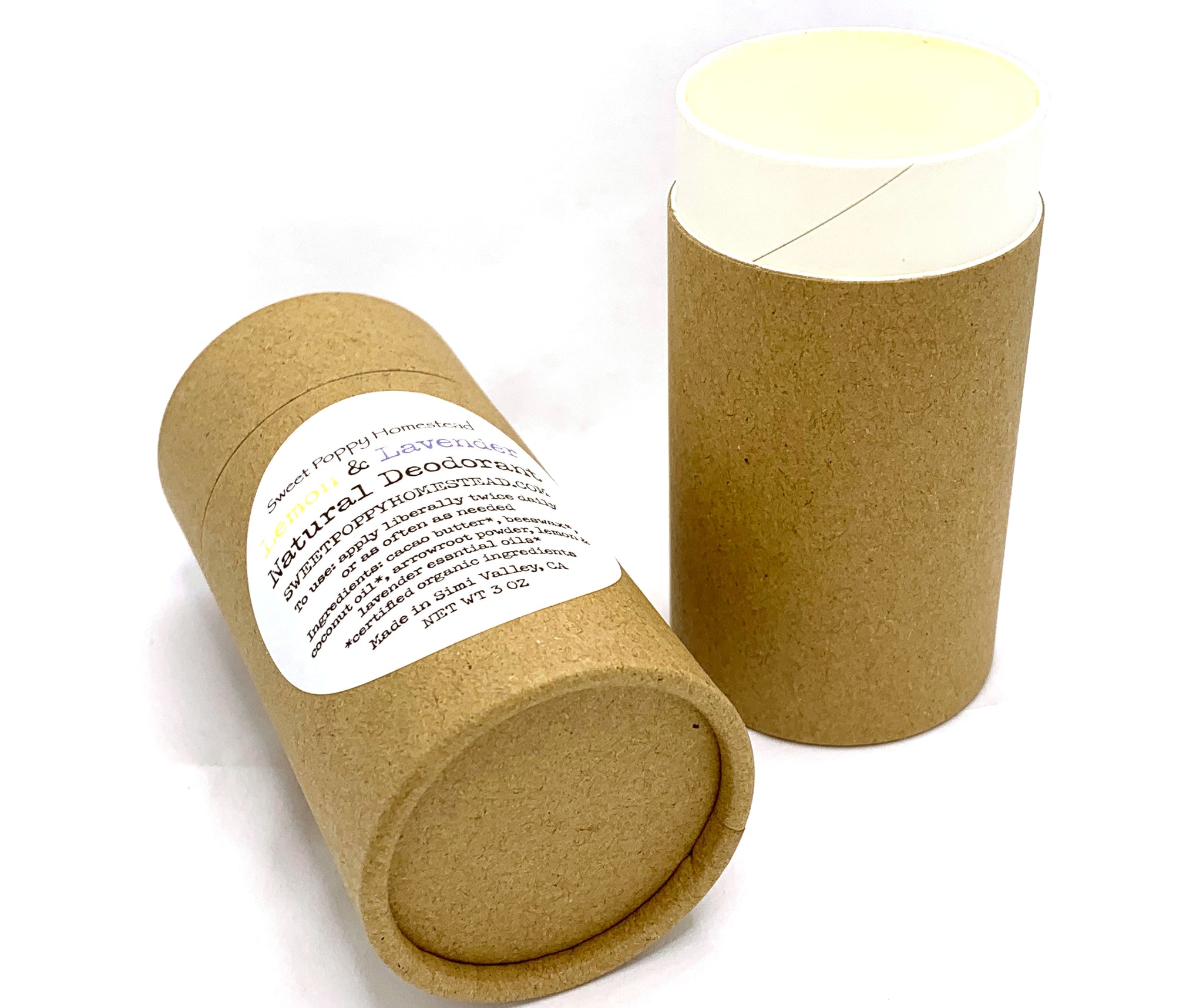 Deodorant packaged in a push up kraft paperboard tube that is 100% compostable and all shipping materials are paper-based and 100% eco friendly.